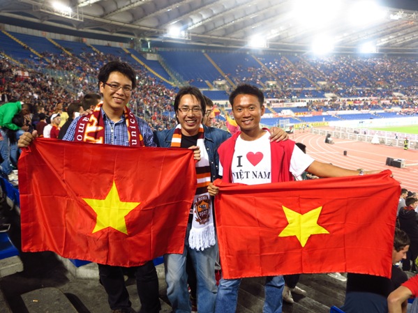 Đám ultra phát hiện được một cổ cổ vũ Napoli ngồi lẫn trong hàng ghế của mình và tẩn cậu ta một trận. Cả một khoảng trống chỗ ngồi quanh chúng tôi để trống. Tác giả giữa sân bóng của Roma - Ảnh: Anh Ngọc Tôi cùng với một đôi cổ khích lệ người Việt đã đứng ở giới tuyến bằng kính ngăn cách giữa hai thế giới đầy lửa căm thù ấy trong suốt trận đấu. Đến giờ tôi vẫn tự hỏi.